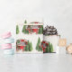 Papier enveloppant avec un thème de Noël mignon et capricieux. Une caravane cosy décorée pour Noël entre quelques pins.
