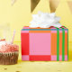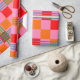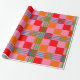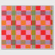 This wrapping paper has a mid-century modern design of red, pink, and orange squares and green and blue lines forming a plaid design.