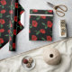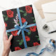 Ce papier d'emballage élégant présente un motif abstrait répétitif d'une rose rouge unique avec des feuilles verts posés sur un arrière - plan noir pur.