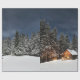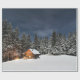 Cabine d'hiver rustique la nuit dans un paysage enneigé.