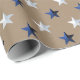 Un papier d'emballage festif pour la période des fêtes de Noël avec étoiles bleu marine et argent sur un arrière - plan en papier kraft rustique. Idéal pour toute occasion et fait un emballage cadeau impressionnant.