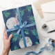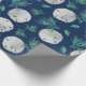 Dollars de sable et papier d'emballage de corail marin sur un rouleau. Des dollars réalistes de trou-clé blanc font un motif avec du corail bleu-vert et des coquillages sur un arrière - plan bleu marine foncé. Parfait pour fêter un anniversaire d'adulte ou envelopper des cadeaux de mariage.