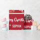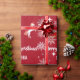 Modern, elegant, and cute personalized Christmas gift wrap for kids, with a unicorn pulling Santa's sleigh (full of gifts); the greeting "Merry Christmas" in stylish typography; and a personalized name. On a Xmas red background, with many cute, festive snowflakes.