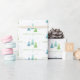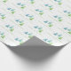 Ce papier d'emballage cadeau de Noël présente un graphique rétrographique de trois arbres apparaissant dans les tons turquoise et vert citron et est accentué de flocons de neige bleu clair. Le texte "MERRY CHRISTMAS" apparaît en vert citron.