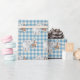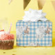Un joli éléphant gris avec un singe accroché à son tronc avec un motif bleu et crème en vichy.