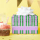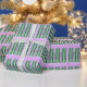 Skis verts sur neige avec papier d'emballage de Noël arrière - plan violet.