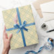 Papier d'emballage jaune pastel clair et joyeux, avec un motif géométrique en diagonale subtil de carrés entrelacés dans une teinte vert sauge poussiéreuse. Idéal pour le printemps, Pâques, baby showers élégants, et un grand cadeau gai.