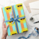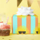 Soleil avec lunettes de soleil foncé sur Aqua & Orange Stripes papier d'emballage personnalisé comprend des rayures aqua et orange avec soleils jaunes souriants avec des teintes sombres cool et de longs rayons de chaleur. Personnalisez-le en ajoutant votre propre texte et/ou en échangeant les images pour vous-même.