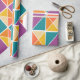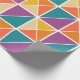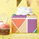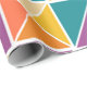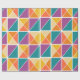 Ce papier d'emballage a un design Bauhaus de carrés en triangles dans les tons orange, jaune, violet et bleu.