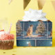 Un chien est assis à côté d'un sapin de Noël enneigé, orné de lumières et d'ornements, étincelant dans la lueur d'une nuit sereine et enneigée