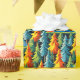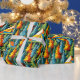 Emballage cadeau d'anniversaire dans des couleurs vintages, vert, tan et orange thème camping enveloppé avec tentes sur un camping et pins.