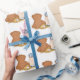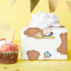 Joli baby shower à thème de baseball ou enveloppement cadeau de premier anniversaire avec un petit garçon dans un casquette de baseball et un gros ours en peluche assis sur un terrain de baseball.