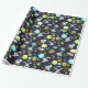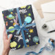 Papier d'emballage à motifs avec un motif mignon et coloré avec toutes sortes d'éléments thématiques de l'espace. Les images comprennent des astronautes flottant dans leurs combinaisons spatiales blanches. Étoiles, planètes et petits navires-roquettes cool, vaisseaux spatiaux et satellites. Design amusant et fou.