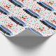 Creative trampoline gymnastics themed holiday gift wrap or party decor featuring Mrs. Claus gymnast jumping on a trampoline surrounded by Christmas candy. To personalize edit text to add name.