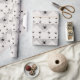 Ce rouleau de papier d'emballage est blanc avec des rangées de toiles d'araignées noires de forme triangulaire avec araignées noires de veuve avec des marquages en sablier rouge.