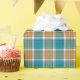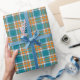 Papier d'emballage dans le bleu de turquoise et le plaid lumineux d'orange, avec des points culminants bleu-foncé, verts, et de blanc. Un motif sportif original de Plaidwerx.