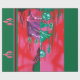 La conception semble être une oeuvre numérique ou stylisée divisée en deux panneaux par une ligne verticale verte. Voici une description détaillée : ・ Panneau gauche : o Présente un collier orné suspendu dans l’air au-dessus d’une roche violette. o La roche est entourée de feuillage vert et rouge. ・ Panneau droit : o Ce côté est une version miroir et légèrement modifiée de la gauche. o Le collier est absent. o Il y a des variations dans le placement du feuillage. La composition symétrique et les couleurs vibrantes et contrastées créent un effet visuel frappant.