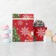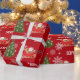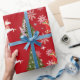 Elegant, modern, festive personalized Christmas wrapping paper with a unicorn pulling Santa's sleigh towards a fir tree decorated with silver baubles. The unicorn has a red and golden mane and tail and the sleigh carries Santa along with many gifts. The text boxes say "Merry Christmas!" and the name of the recipient (make sure you personalize it!). On a Christmas red background, with many cute snowflakes.