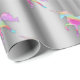 Un joli papier d'emballage de licorne qui convient le mieux aux cadeaux d'anniversaire de naissance d'une petite fille, décorations de fête de licorne (ou même pour scrapbooking) avec un motif de licornes de couleur arc-en-ciel éparpillées sur un arrière - plan d'argent.