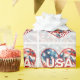 Papier d'emballage amusant avec rouge, blanc et bleu, avec "USA". Vous pouvez conserver le texte ou le modifier. Vous pouvez également ajouter le nom désiré à cet emballage cadeau. Utilisez le modèle pour personnaliser.