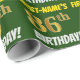 Ce papier d’emballage comporte un message comme "FIRST-NAME’S 86th BIRTHDAY!", avec le "86th" ayant une apparence de couleur fausse/imitation or, et avec le nom et "BIRTHDAY" dans une police amusante et audacieuse. Le nom peut être customisé, et l'arrière - plan est vert de couleur. Un papier comme celui-ci pourrait peut-être être utilisé pour envelopper les cadeaux d'anniversaire donnés à quelqu'un pour célébrer leur quatre-vingt-sixième anniversaire. [~Z0000208]