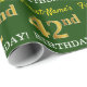 Ce design papier d’emballage comporte un message comme "42e anniversaire de prénom!", avec le "42e" ayant une apparence de couleur fausse/imitation or. Le nom peut être customisé, et l'arrière - plan est vert de couleur. Il pourrait peut-être être utilisé pour envelopper les cadeaux donnés pour le quarante-deuxième anniversaire de quelqu’un. [~Z0000179]