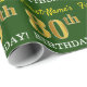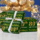 Ce design papier d’emballage comporte un message comme "80e anniversaire de prénom!", le "80e" ayant une apparence de couleur fausse/imitation or. Le nom peut être personnalisé, et l'arrière - plan est vert couleur. Il pourrait peut-être être utilisé pour envelopper les cadeaux donnés pour le quatre-vingtième anniversaire de quelqu’un. [~Z0000179]
