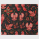 Vibrant red birds with detailed patterns are set against a black background, surrounded by intricate floral and leafy designs, creating a lively, ornamental scene.