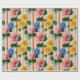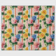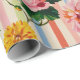 This vintage floral stripe gift wrap features hand-painted blooms layered over soft pastel stripes for a cheerful, garden-inspired look. Blush pinks, warm yellows, and rich blues are balanced with lush green leaves, creating a design that feels joyful, artistic, and timeless.