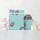 Un emballage cadeau vert avec des éléments liés au voyage : un avion, un bagage, une caméra photo et la tour Eiffel.
