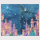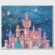 Vue nocturne d'un château rose avec princesse devant profiter d'une promenade nocturne