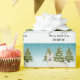 Illustration originale de Destei d'un mignon berger suisse blanc / chien de race berger allemand de couleur blanche. Le chien est placé dans une scène hivernale avec trois sapins verts. L'arrière - plan est un dégradé bleu à blanc qui donne un aspect froid d'hiver. Il y a une zone de texte personnalisable qui se lit maintenant : "Joyeux Noël !" avec un nom personnalisé.
