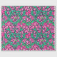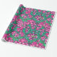 Papier à envelopper dans un William Morris, Art Nouveau, imprimé textile d'iris et de feuilles, numériquement rehaussé et coloré, en fuchsia et rose glace, vert paon et blanc, sur un vin profond violet arrière - plan