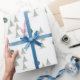 This white Christmas wrapping paper features delicate pine trees inspired by quiet winter forests.