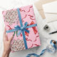Add a playful twist to your holiday gifting with this pink Christmas bow and ribbon wrapping paper. This cheerful print features a soft pink background decorated with glossy red satin bows, candy-stripe gift toppers, curling decorative ribbons, and a scattering of snow-dust texture for a festive touch.