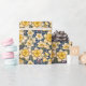 Be ready for those first shoots of daffodils this spring, as it is so hard to time the weather these days. These pretty garden print shows creamy and yellow daffodils on a mellow marine blue background dotted with small pink flowers. Seamless image.
