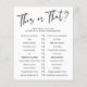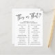 PAPIER Ceci ou Celui qui connaît le jeu de Fête des mariées. Ajoutez une touche d'amusement et d'excitation à votre douche nuptiale avec ce jeu "Qui connaît la meilleure mariée"! Testez la connaissance de la future mariée de vos invités avec 12 questions de style "ceci ou cela", couvrant tout, des préférences mariages aux rêves de lune de miel. Parfait pour des rencontres animées et la création de souvenirs durables! Entièrement personnalisable - vous pouvez modifier n'importe quelle question pour convenir à votre événement! Veuillez nous contacter à cedarandstring@gmail.com si vous avez besoin d'aide pour la conception ou les produits correspondants. 🌟 Si vous cherchez une version de cette liste téléchargée instantanément (imprimer à la maison), veuillez aller ici : https://www.zazzle.com/this_or_that_who_knows_the_bridal_shower_game_invitation-256401720375548604