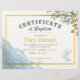 Ce design est composé de feuilles d'aquarelle, d'eau et de colombe. C'est un beau design moderne pour un certificat de baptême.
