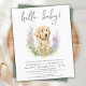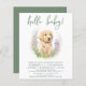 Invitation vos amis et votre famille pour célébrer l'arrivée de votre nouveau bébé garçon avec cette adorable invitation de chiot bonjour, accessoires de fête et cadeaux. Cette invitation baby shower présente un récupérateur doré à l'aquarelle peint à la main, parfait pour les amoureux de les chiens ! Le design est moderne et tendance, avec un jeu de couleurs vert sage et le texte "bonjour bébé" pour célébrer l'arrivée prochaine de votre nouveau bébé. DROIT D'AUTEUR © 2023 Judy Burrows, Black Dog Art - Tous droits réservés. Bonjour Baby Chien Chien Chien Chien Chien Moderne Sage Vert Baby shower Invitation