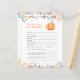 "Un petit citrouille est en route. Célébrez avec ce citrouille de dessins animés sur le thème du baby shower ! Aquarelle caricature kawaii citrouille avec casquette d'automne (casquette) et feuilles d'automne. Au verso de la carte se trouvent les feuilles d'automne.