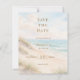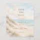 A watercolored sandy beach, sand dunes, ocean waves background. Personalize and add a date and your names. The text: Save the Date is written with a large trendy hand lettered style script.