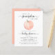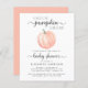 Une conduite douce, gaie et économique neutre par rapport au genre par invitation baby shower avec "A Sweet Little Citrouille Is On Her Way" écrit dans un mélange de typographie moderne gris doux et de script élégant, et une aquarelle orange pastel d'un citrouille. Vous pouvez personnaliser le nom de la mère et les détails de la douche dans une simple typographie grise.