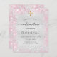 Une confirmation moderne et élégante, célébrant une fille. Fond métallisé argenté faux décoré de poussière de paillettes roses fausses et d'une croix dorée. Personnalisez et ajoutez un nom et les détails de la fête. Lettres de couleur noire.