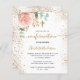 Un arrière - plan blanc décoré de verdure d'eucalyptus, d'or rose et de rose rose rousse, de feuilles dorés et de parties scintillant faux or en chute libre. Personnalisez et un nom et des détails de la cérémonie. Lettres noires et dorées. Retour : arrière - plan blanc avec gouttes de parties scintillant en faux or