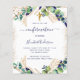 A l'avant : Un arrière - plan blanc décoré de verdure d'eucalyptus et de feuilles dorés et de parties scintillant en faux or scintillent. Une croix d'or. Personnalisez et le nom de l'enfant et les détails de la cérémonie. Texte bleu. Retour : arrière - plan bleu marine.