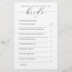 Vérifiez si les invités connaissent bien la mariée à être avec cette carte de jeu de douche nuptiale design. Dotée d'un design minimaliste aux accents doux de rougeur et d'une typographie élégante, cette activité bidirectionnelle promet des réponses ludiques et légères qui éveillent la conversation et le rire. Un brise-glace parfait et gardez le saké pour des douches modernes ou neutres. Coordonnées avec la Fête des mariées moderne minimale complète | La collection Future Mrs.