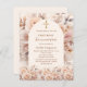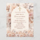 Une invitation moderne et élégante pour une première communion. Crème, arrière - plan couleur pêche, arche encadrée, décorée de fleurs crème. Personnalisez et ajoutez votre nom et les détails. 1 feuille = 1 invite imprimé bord à bord.