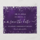 Une carte Save the Date glamour pour une fête d'anniversaire de 50e (ou tout âge). Un arrière - plan violet de couleur inégale. Décoré avec de la poussière de parties scintillant en faux argent. Le texte : Save the Date est écrit avec un grand script de style à la main tendance.