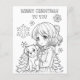 Page de coloriage de Noël. Jolie couleur moi papier de Noël avec une petite fille d'anime tenant un chien chiot entouré de flocons de neige.