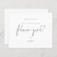 Demande minimale de Fleur de Script Noir. Un prix économique 4,5 po x 5,6 po alternatif. Disponible dans un STOCK CARD SEMI GLOSS 110 lb qui est l'option par défaut (plus épais pour les invitations) Les enveloppes sont en option et sont légèrement plus grandes que la taille de la carte. Style simple en noir et blanc classique pour poser cette question toute importante. Flower Girl est dans un script élégant est au centre. Les couleurs du texte et de l'arrière - plan peuvent être modifiées si vous souhaitez mieux convenir à votre thème mariage via l'option customiser plus loin.